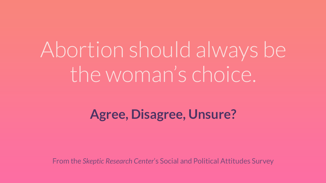 Although abortion is often framed as a women’s issue, men make up half of the electorate and are more often pro-life.1 The legislative branch of the U.S. government is predominantly male: there are currently 125 women serving in the House (28.7 percent) and 24 in the Senate (24 percent),2 and five of the nine justices serving on the Supreme Court of the United States are men, four are women. So, understanding the correlates of men’s support for—or opposition to—abortion is certainly worthwhile, though often overlooked in the public discourse. Scientists collaborating with the Skeptic Research Center are not medical doctors or experts in embryology. We cannot begin to adjudicate the tense and important debate about abortion, but as social scientists we hope to shed light on some under-reported findings that may help the public and policymakers better understand this complex issue.