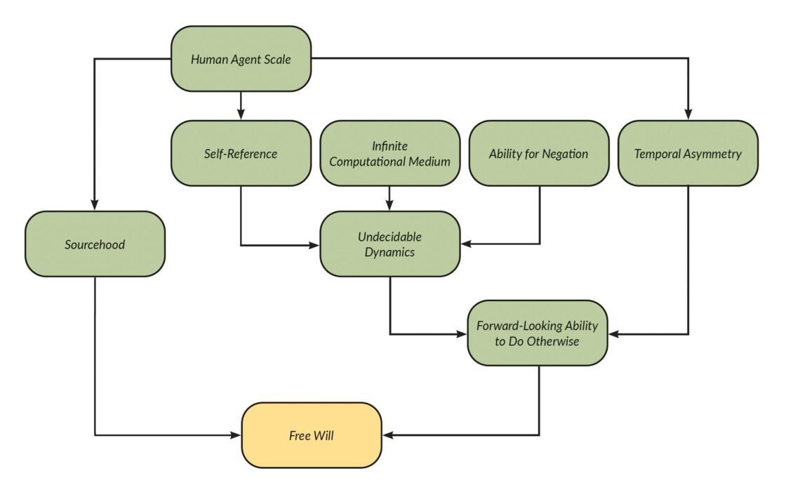 Figure 1 (at the top of this article) shows the relationships between the concepts discussed in this article. An understanding of the human agent at the scale where conscious humans actually exist leads to recognition of the self as the source of one’s actions, recognition of the relevance of temporal asymmetry to human choice, and recognition of self-reference as causally relevant to human actions. Self-reference, in combination with access to an infinite computational medium and the ability to implement negation results in undecidable dynamics. This entails the ability to do otherwise in the forward-looking sense, which is the only sense that makes any sense when temporal asymmetry is taken into account. The resulting total picture is that we (humans) meet two criteria for real free will: the forward-looking ability to do otherwise and being the source of one’s own actions.