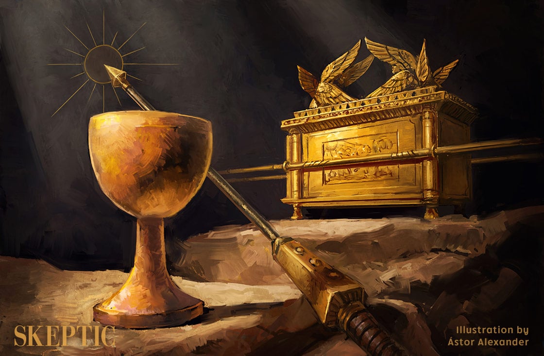 Compared with both the Spear of Destiny and the Holy Grail, the Ark of the Covenant has far more substance as a historic artifact. In his 2017 book The Exodus, Dr. Richard Eliott Friedman makes the case that the Exodus was a historical event, only minus the plagues devastating Egypt, and Moses himself parting the waters of the Red Sea, and instead involving only the Levites.3 Among the evidence that Levites—who became a priestly tribe among the Israelites and did not hold a tribal territory—originally came from Egypt are the prevalence of Egyptian names in that tribe, and the similarity of the Ark of the Covenant as described in Exodus 25:10–15 to ceremonial boats carried in Egyptian religious processions. The placement of the Ark in the first temple is described in 1 Kings 8:6–9. In 587 BCE, the Chaldeans, under Nebuchadnezzar besieged Jerusalem, sacked the city, deported its population, and utterly destroyed the temple housing the Ark. This is described in 2 Kings 25:8–16. Not only did the Chaldeans destroy the temple but, according to 2 Kings, they also smashed the various priestly brass implements and melted down the brass. While this account details the temple’s utter destruction, it doesn’t mention the Ark, thus leaving its fate open to speculation.