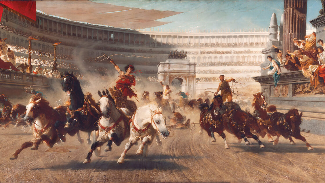 But the Nika Riot wasn’t the sort of race riot you might imagine. The race in question was the chariot race. The color division wasn’t between black and white but between blue and green—the colors of the two main chariot-racing teams. The teams’ supporters, who were referred to as the Blue and Green “factions,” proudly wore their team colors, not just in the hippodrome but also around town. To help distinguish themselves, many Blues also sported distinctive mullet hairstyles, like those of 1970’s rock stars. Both Blues and Greens were fiercely loyal to their factions and their colors. The chariots and drivers were a secondary concern; the historian Pliny asserted that if the drivers were to swap colors in the middle of a race, the factions would immediately switch their allegiances accordingly.
