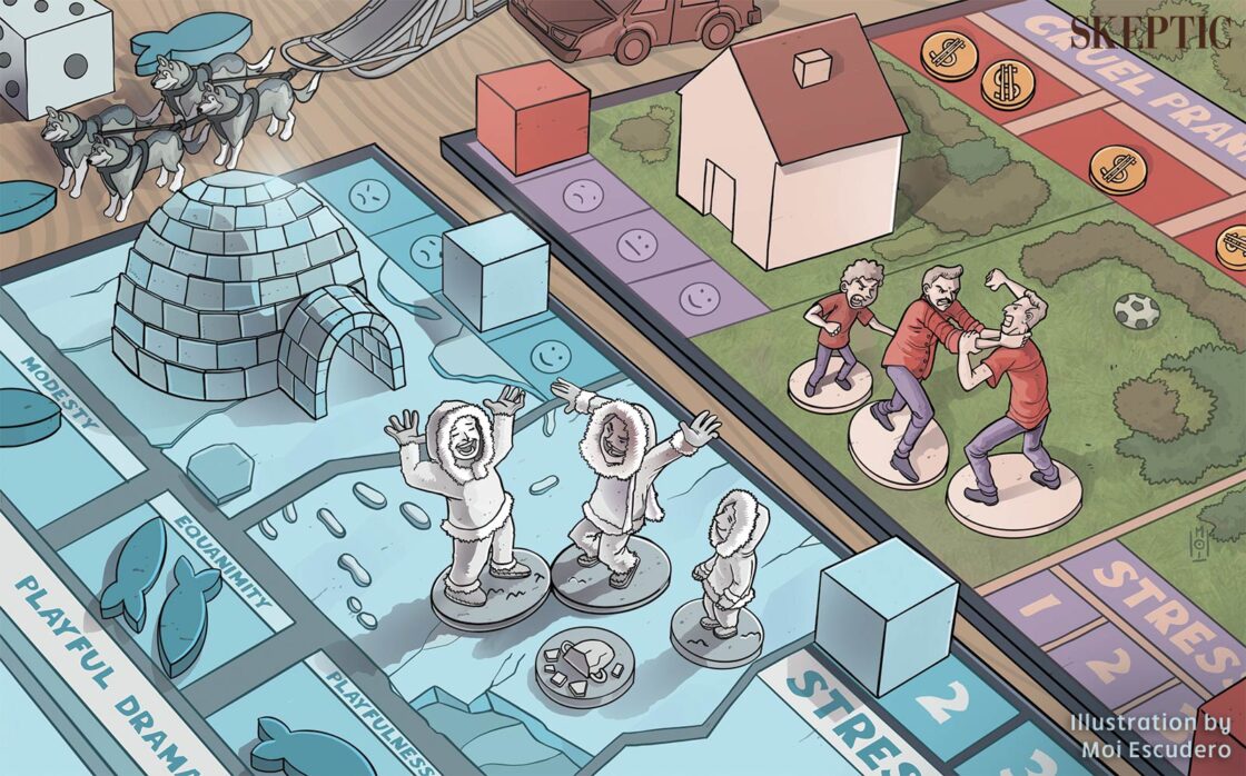 During her sojourns among the Inuit throughout the 1960s and 70s, pioneering anthropologist Jean Briggs observed some peculiar parenting practices. In a chapter she contributed to The Anthropology of Peace and Nonviolence, a collection of essays from 1994, Briggs describes various methods the Inuit used to reduce the risk of physical conflict among community members. Foremost among them was the deliberate cultivation of modesty and equanimity, along with a penchant for reframing disputes or annoyances as jokes. “An immodest person or one who liked attention,” Briggs writes, “was thought silly or childish.” Meanwhile, a critical distinction held sway between seriousness and playfulness. “To be ‘serious’ had connotations of tension, anxiety, hostility, brooding,” she explains. “On the other hand, it was highest praise to say of someone: ‘He never takes anything seriously’.”1 The ideal then was to be happy, jocular, and even-tempered.