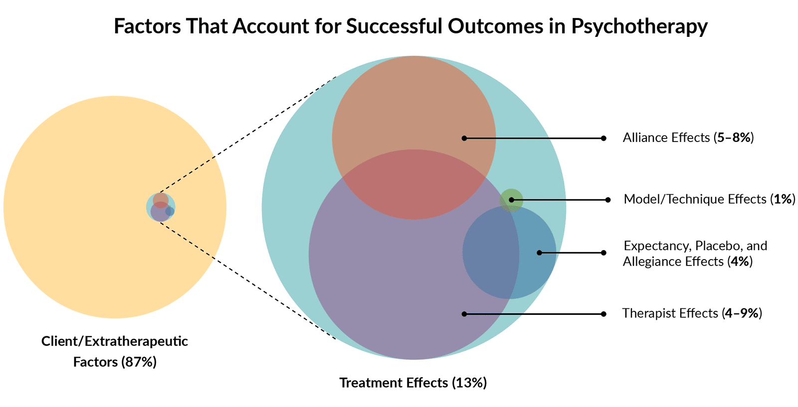 Indeed, clients and their extra-therapeutic factors contribute 87 percent to outcomes of psychotherapy!30 Extra-therapeutic factors comprise the client’s personality, their daily environment, their friends, family, work, good relationships, and community support. On average clients spend less than one hour per week with a therapist. The extra-therapeutic factors are the components of the client’s life to which they return, and which make up the other 167 hours of their week. This begs the question “does this mean that there’s nothing we can do about it?” The key is for therapists to a) attune to these outside factors and resources, and b) tap into them. The remaining 13 percent of treatment effects which accounts for positive outcomes in therapy is made up of: the individual therapist, between 4–9 percent; the working alliance (relationship) between therapist and client, 4.9–8 percent; the expectancy/placebo and rationale for treatment, 4 percent; while the model of therapy contributes an insignificant 0–1 percent. This highlights that who the therapist is and how they relate to their clients is the main variable accounting for positive outcomes outside of the client’s extra-therapeutic factors.