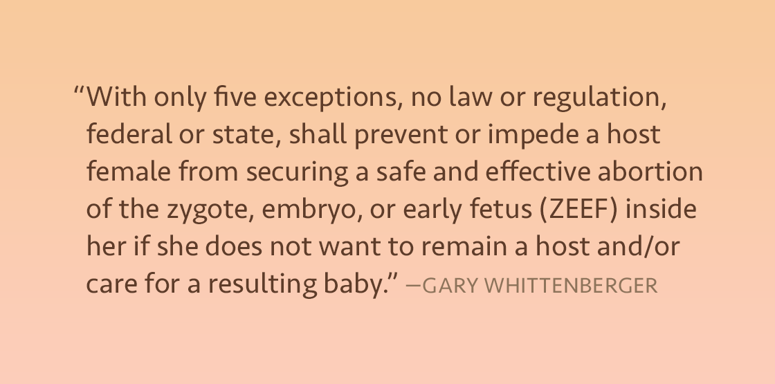 It seems clear that Gary Whittenberger accepts as fact that human life begins at conception, as he repeatedly refers to the developing “organism” as “human.” In justifying abortion during the first stages of development, however, he carves out a separate category of “human” and argues that abortion should be restricted to the “human organism” only once it becomes a “person.” He calls that his “pro-person position.”