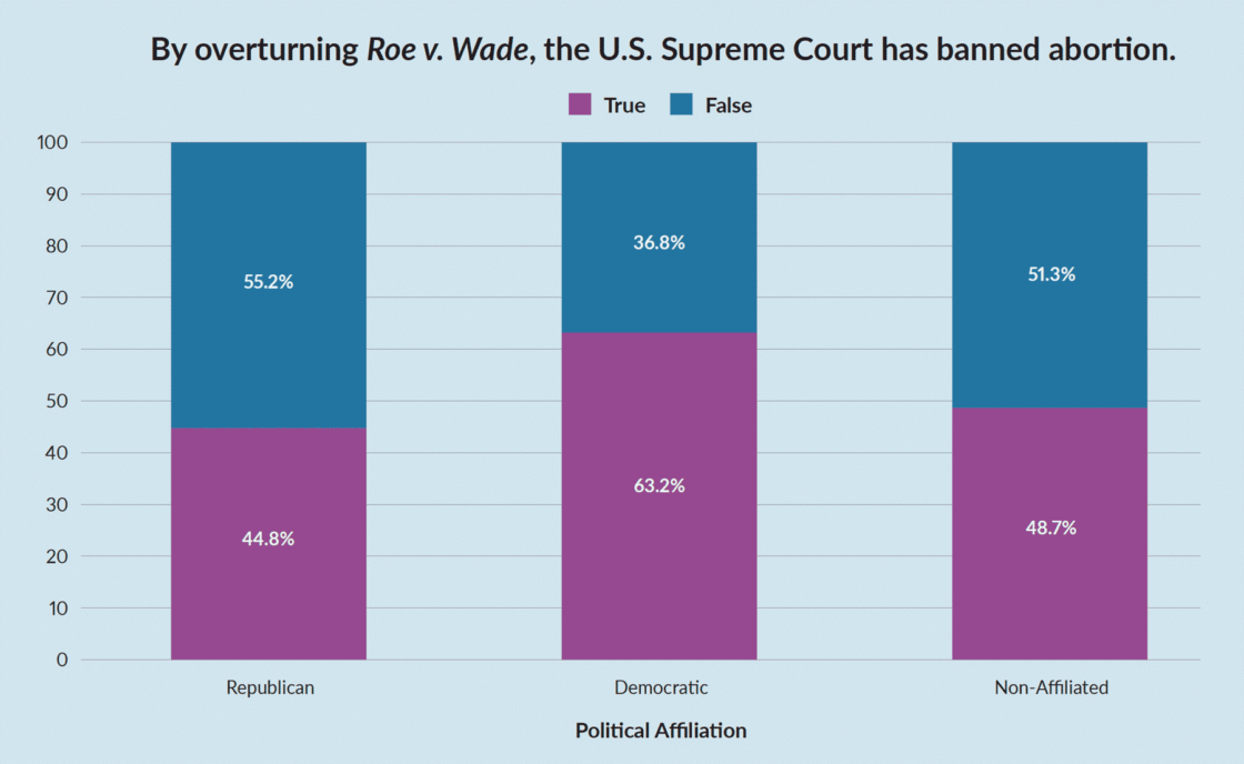 Our second accuracy question pertained to the recent Supreme Court overturning of Roe v. Wade: “By overturning Roe v. Wade, the Supreme Court has banned abortion,” with two answer options: “true” or “false.” Of course, the overturning of Roe v. Wade did not ban abortion; rather, it delegates abortion policy to state governments instead of to the federal government.
