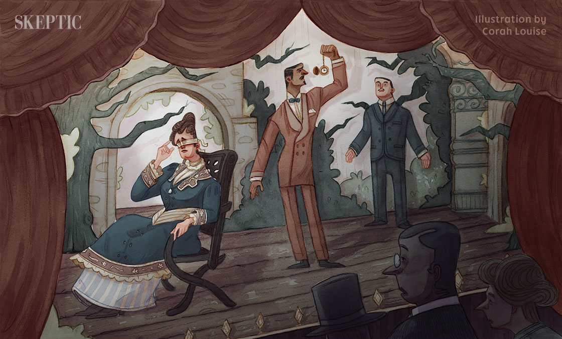 Two-person theatrical mindreading acts have been popular in the U.S. and Europe since the mid-1800s, with even earlier roots. In the most common form of this telepathy act, small objects shown to one partner roaming in the audience are correctly identified by the second performer, who is blindfolded and on stage, with no apparent communication between them.