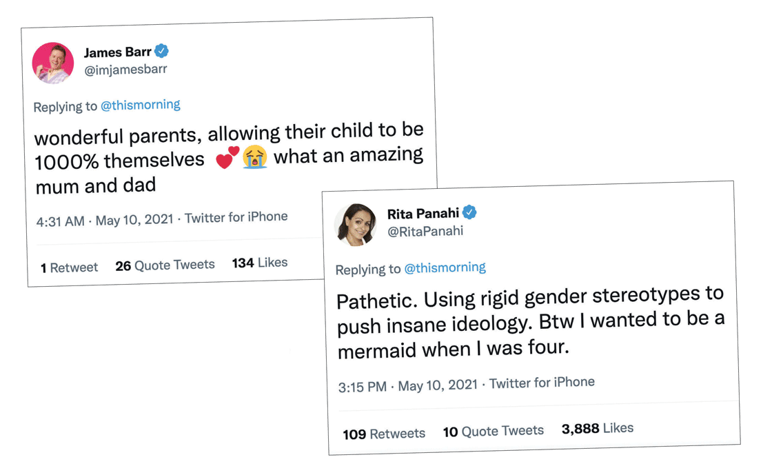 Many sources of mainstream media, most notably those with a political bent, present this issue as a left/right battle. They portray liberals as supporting trans kids and their access to medical interventions in order to save their lives.10 They present anyone who objects to these treatments as conservative, transphobic bigots, who call these treatments experimental and dangerous11 and want to ban all medical interventions.12 The two tweets (above) capture the sentiments of these polarizing sides. What was just a few years ago a topic of debate is now a test of loyalty.13