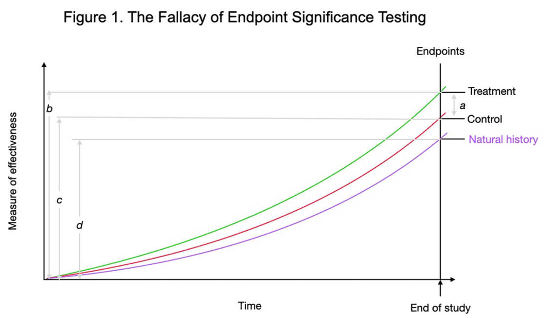 Figure 1. Most studies focus on significant difference at study endpoints, average treatment versus average control outcomes, distance a. The better measure of condition effectiveness is the relative improvement from the start of the study, b versus c. The improvement of the control group is nearly 80% of the treatment group by study’s end. So, for non-life threatening maladies, why treat when 80% of the relief is accomplished with the control group, which is usually much safer and cheaper. The “natural history” control group is shown to illustrate the large degree to which time heals most wounds.