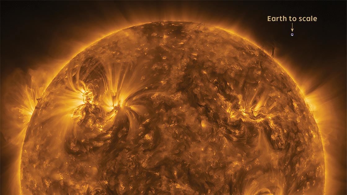 The highest resolution image of the Sun’s full disc and outer atmosphere (the corona) ever taken, as seen by Solar Orbiter in extreme ultraviolet light from a distance of nearly 47 million miles. This stellar image is a mosaic of 25 photographs taken on March 7, 2022 by the high resolution telescope of the Extreme Ultraviolet Imager (EUI) instrument. A tremendous thermonuclear furnace, our Sun radiates about 134,000 terawatts (TW) of continuous power to Earth’s surface, about 7000 times more than the entire population consumes from all current sources. An image of Earth is included for scale, in the upper right corner of this page. Credit: ESA & NASA/Solar Orbiter/EUI team; Data processing: E. Kraaikamp (ROB)